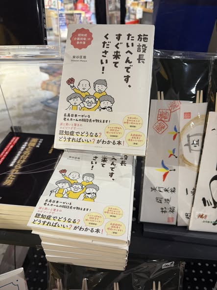 そして有難いことに、そこに私の拙著『施設長たいへです、すぐ来て下さい!』も便乗させて頂き、面陳&平積みで展開していただいています!